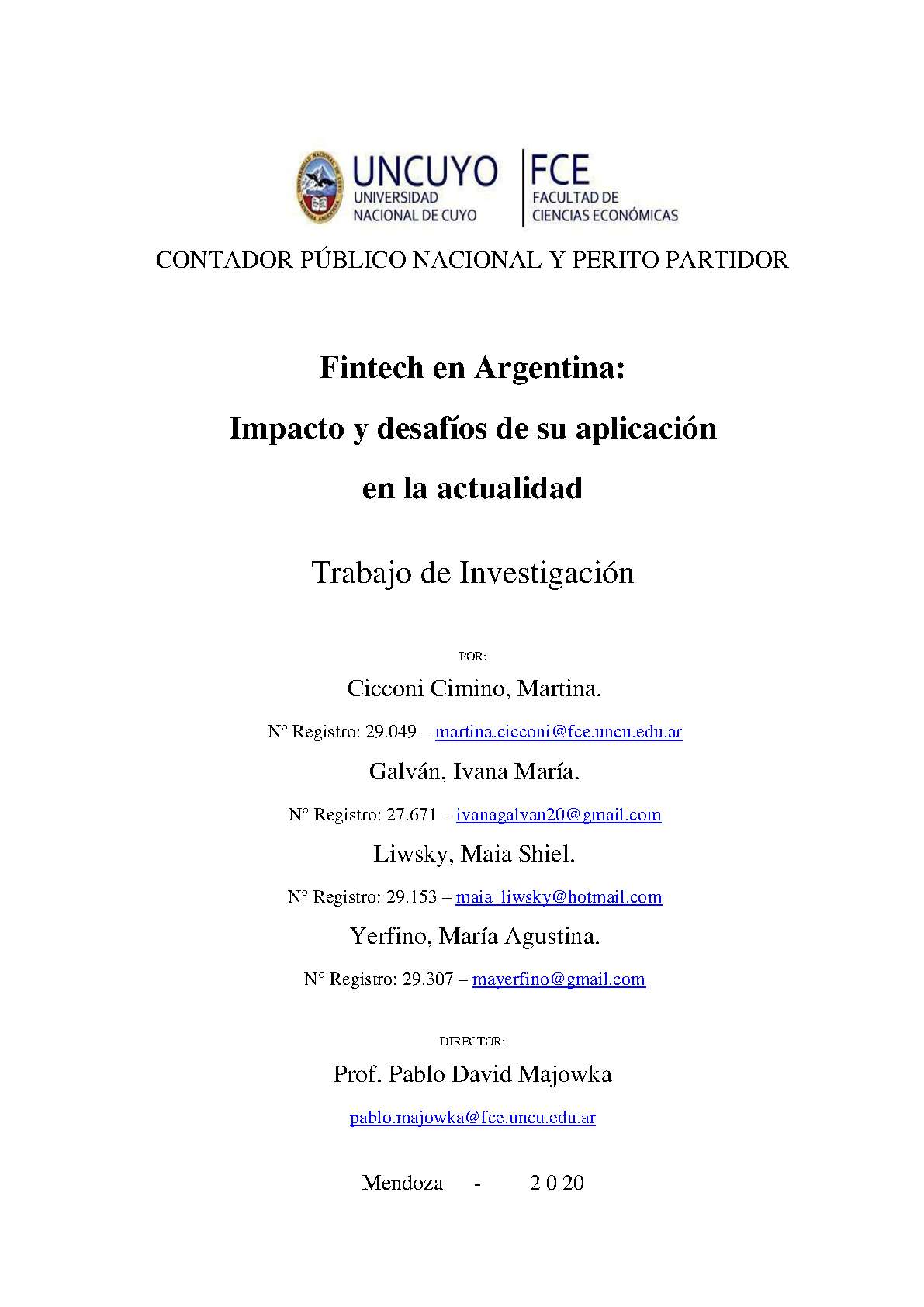 En el siguiente trabajo investigamos el impacto y los desafíos de las fintech en Argentina en la actualidad. El mismo fue desarrollado a partir de fuentes secundarias de información y datos relevados de primera mano mediante encuestas, basado en un enfoque mixto combinando la investigación del tipo cuantitativo y cualitativo. En primer lugar procedimos a una conceptualización e investigación sobre las principales líneas de actividad y el origen de estas financieras; luego en el desarrollo del trabajo abordamos los siguientes tópicos: la relación entre las fintech y el sistema bancario tradicional, el régimen normativo aplicable, las oportunidades y desafíos a los que se enfrentan en su accionar habitual y datos estadísticos respecto a la utilización de las mismas.